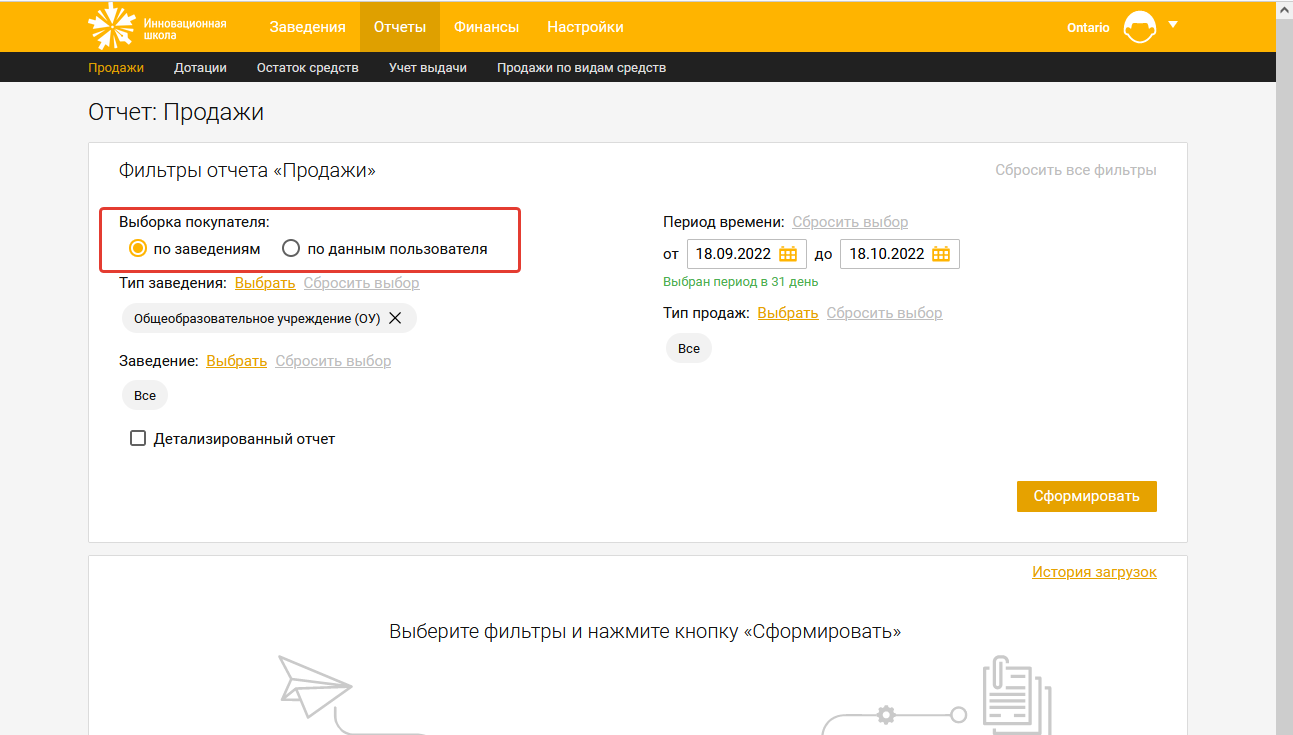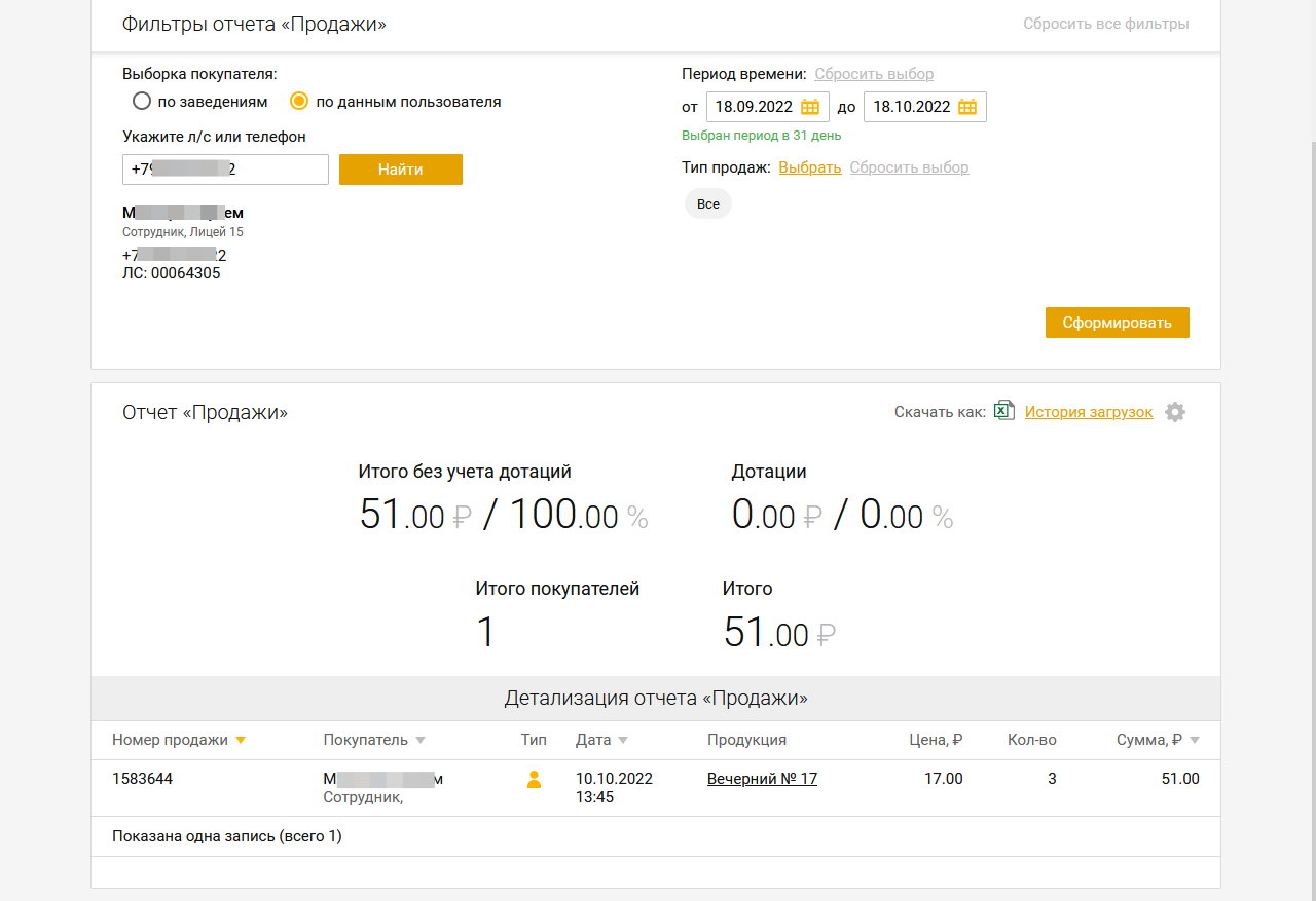 В отчете "Продажи", в фильтрах, реализовали возможность выборки пользователя "по заведениям" или "по телефону или лицевому счету".