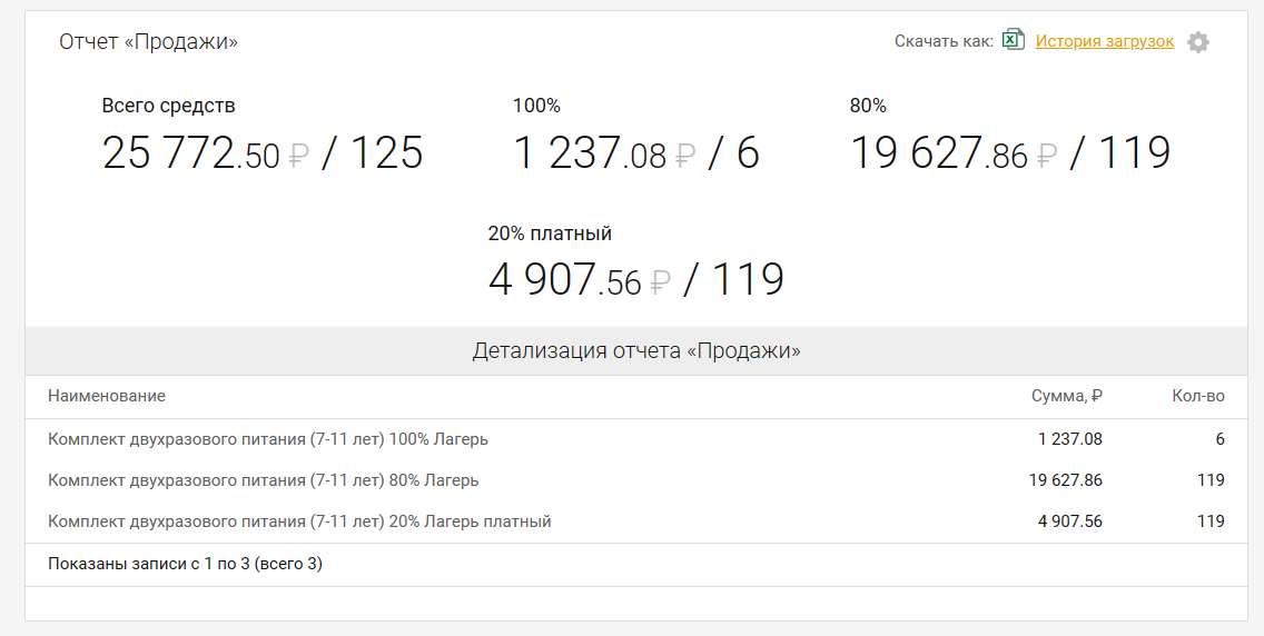Блок с итоговыми данными показывает разбивку данных по % соотношению возмещений из бюджета, а в блоке с детализацией дополнительно еще группировка по комплектам.