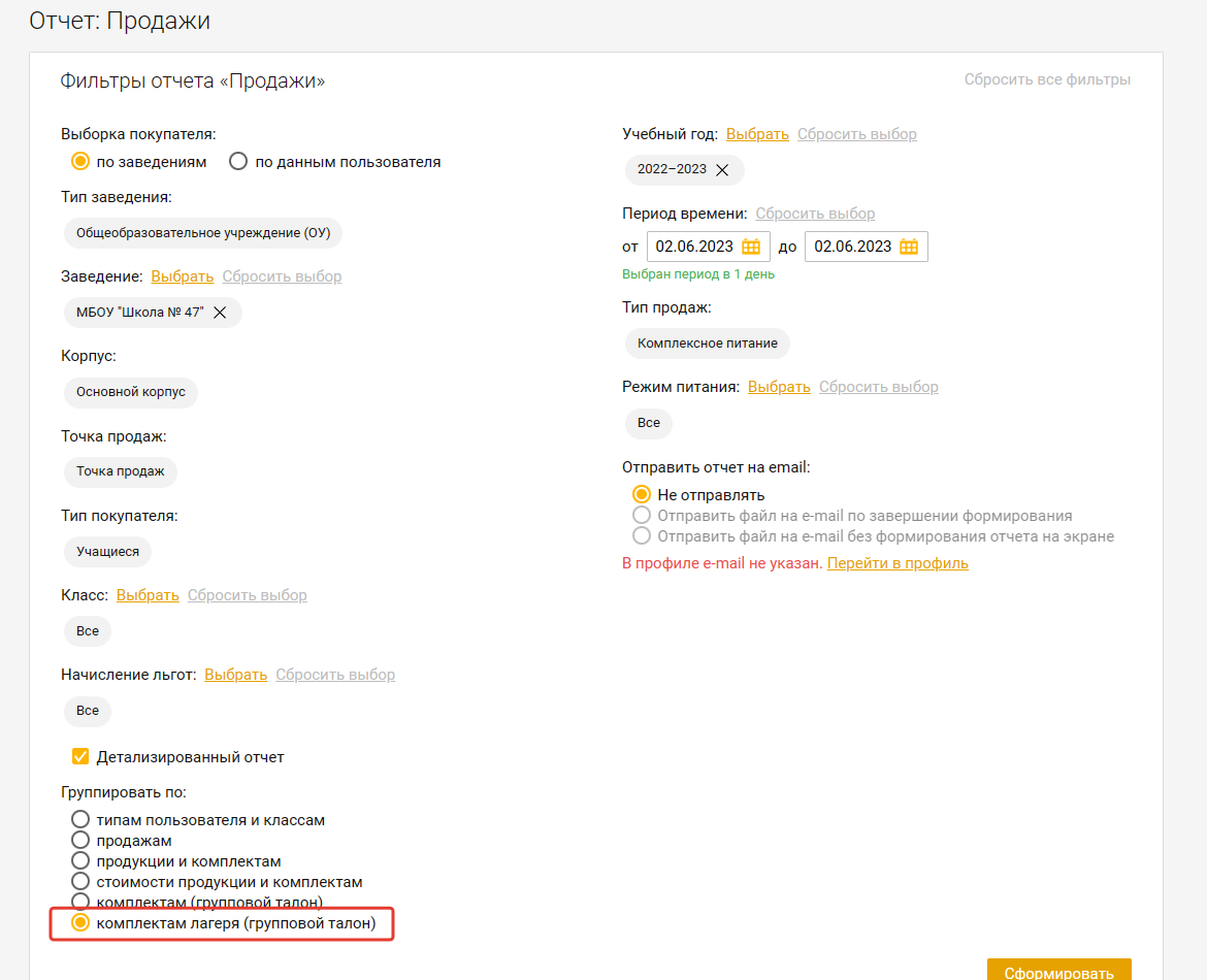 # Отчет "Продажи", группировка "комплектам лагеря (групповой талон)"