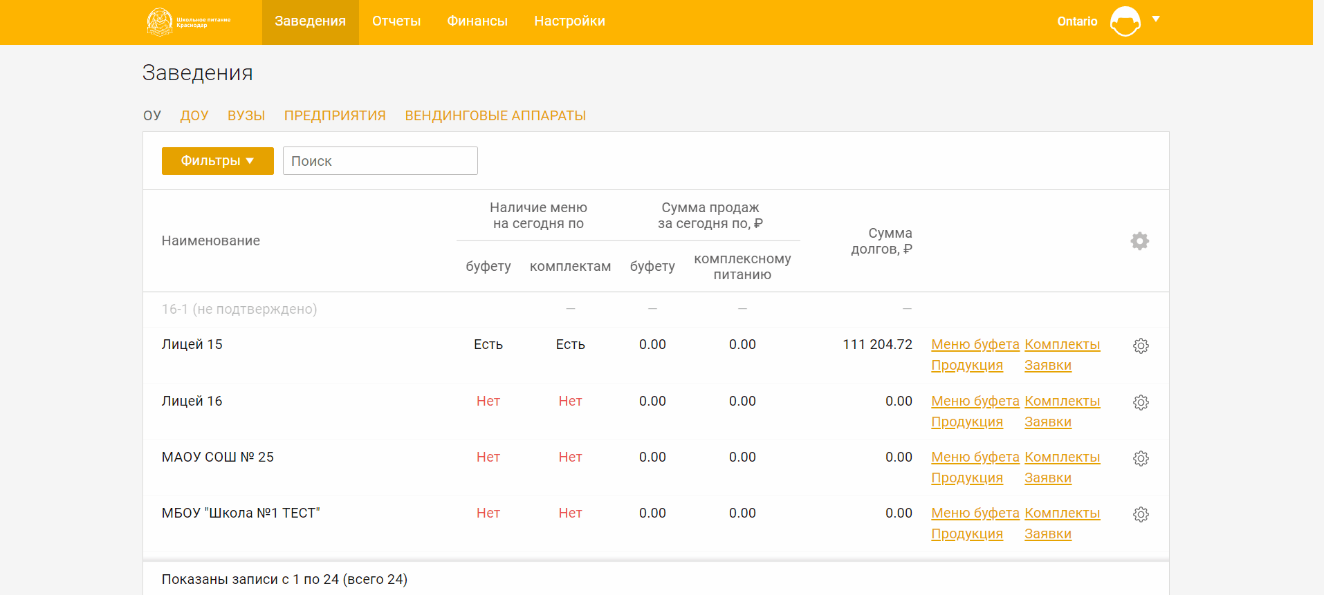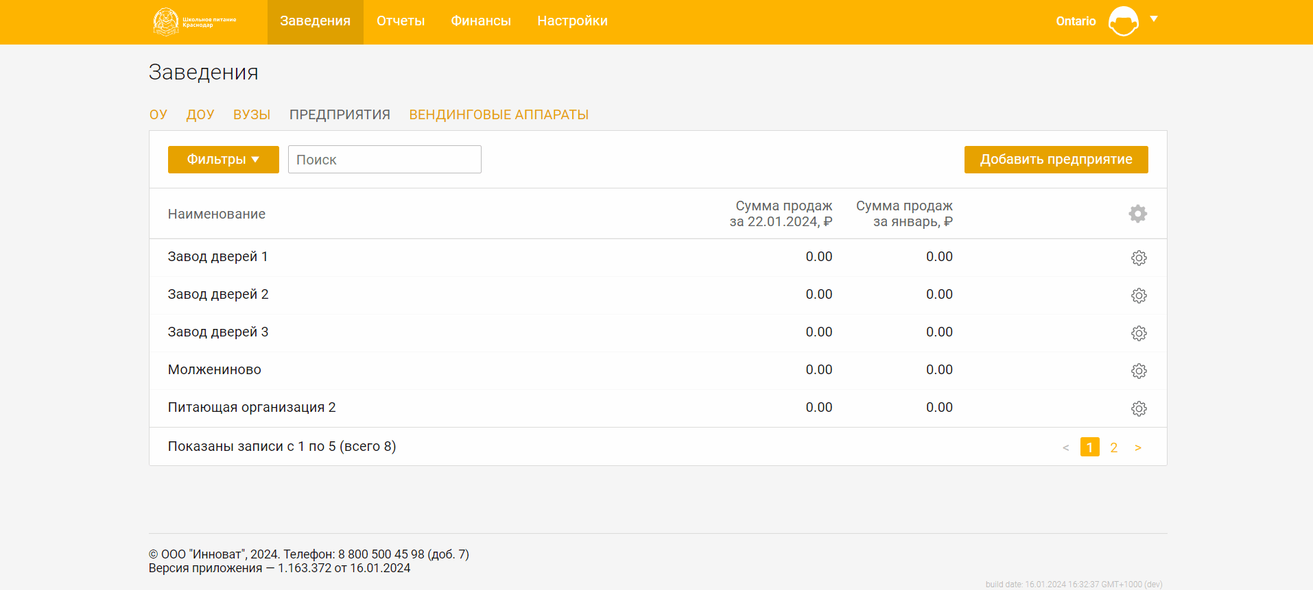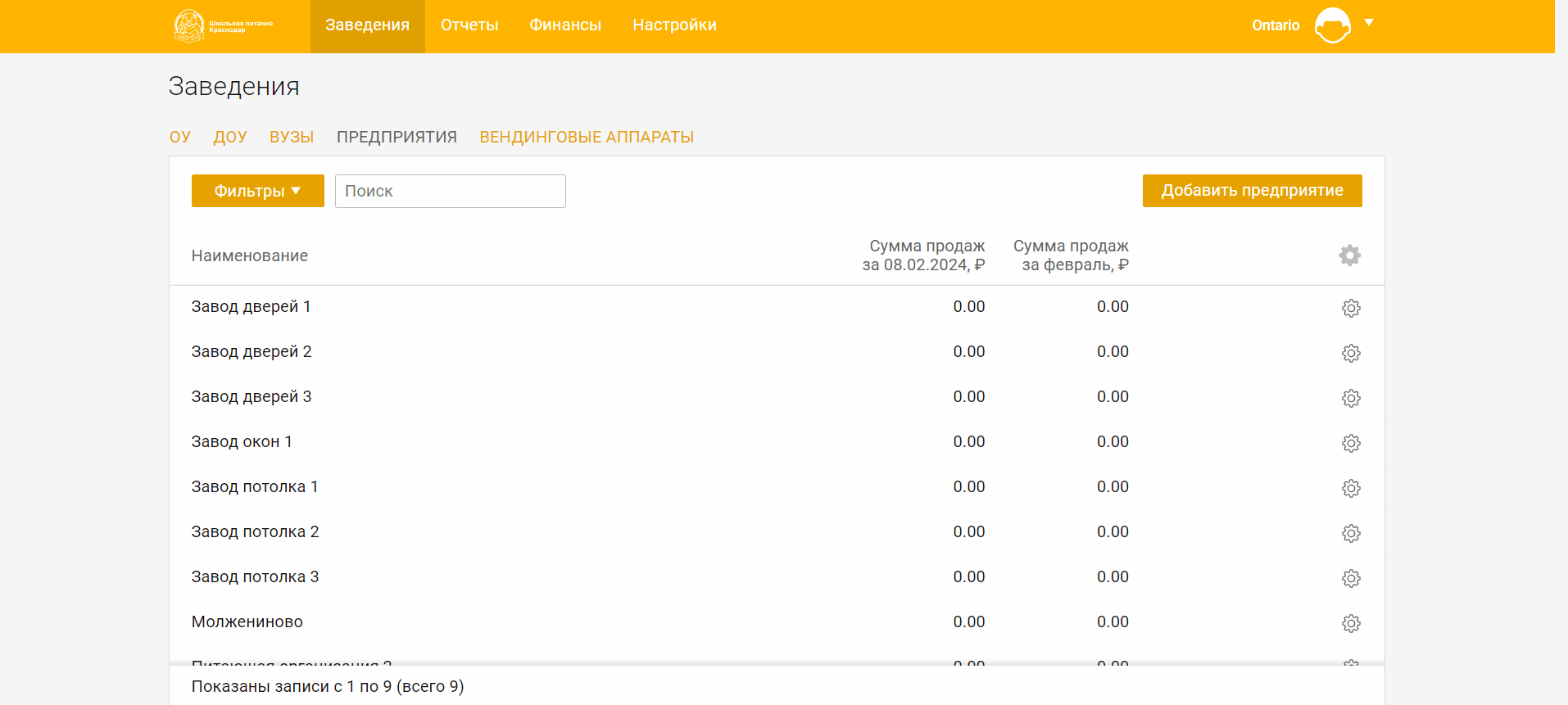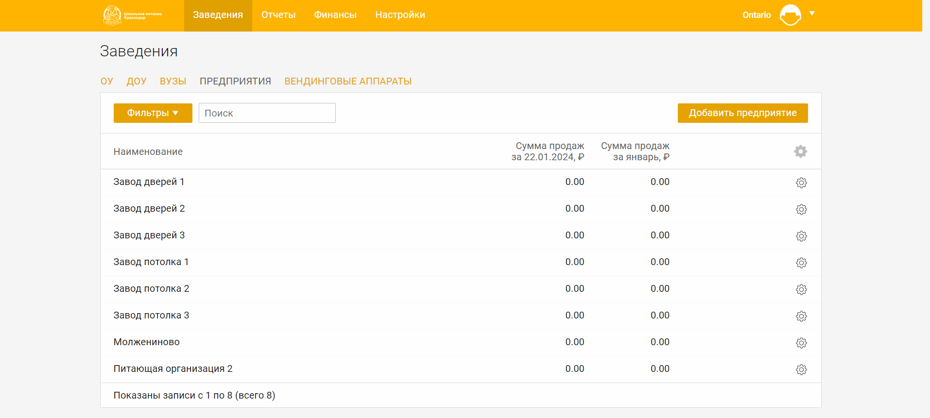 Для просмотра сведений о предприятиях выберите вкладку **Предприятия** в разделе **Заведения**.