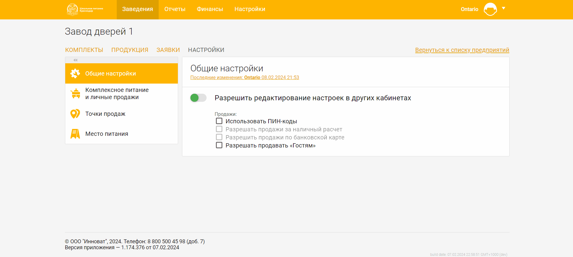 * **Комплексное питание и личные продажи** — на вкладке вы можете, как и на вкладке [<mark style="color:yellow;">**Комплексное питание и личные продажи**</mark> <mark style="color:yellow;">заведения</mark>](https://sotrudniki-pp.gitbook.io/web-pp/novyi-kabinet/new-zavedenie/settings/complex-sales):